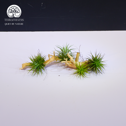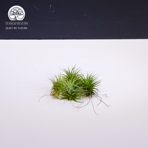 Tillandsia Ionantha Scaposa nổi bật với lá nhỏ, mảnh, mọc dựng đứng và tỏa đều, tạo thành dáng cây thuôn gọn. Khi trưởng thành hoặc chuẩn bị ra hoa, lá có thể ngả sang sắc hồng nhạt – đỏ cam đầy cuốn hút. Đây là một trong những giống cây Không Khí mini được ưa chuộng vì dễ phối hợp trong terrarium và tiểu cảnh DIY.