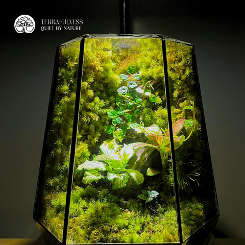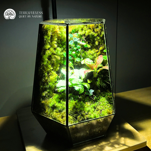 Terrarium Ánh Rừng Đêm là một tác phẩm nghệ thuật sống mang phong cách hiện đại kết hợp thiên nhiên nguyên bản. Bể đa giác đứng với lớp kính cao cấp giúp phô bày trọn vẹn vẻ đẹp của rêu xanh và cây trồng nhỏ. Nét độc đáo của sản phẩm nằm ở hệ thống đèn LED chiếu sáng từ trên, tạo nên hiệu ứng ánh sáng lung linh như rừng sâu khi đêm về.