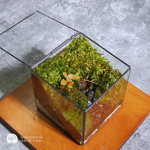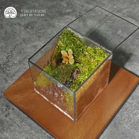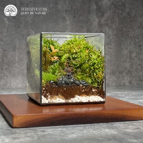 Terrarium Hoa Trên Đá được thiết kế trong bể kính Cubic vuông vắn, nhỏ gọn. Bố cục gồm rêu xanh phủ mềm mại, fittonia đỏ tươi, cây lá tròn và lá dài kết hợp cùng sỏi, nhánh lũa decor. Tất cả tạo nên một tiểu cảnh tự nhiên hài hòa, gợi hình ảnh khu vườn nhỏ xinh như trong truyện cổ tích.