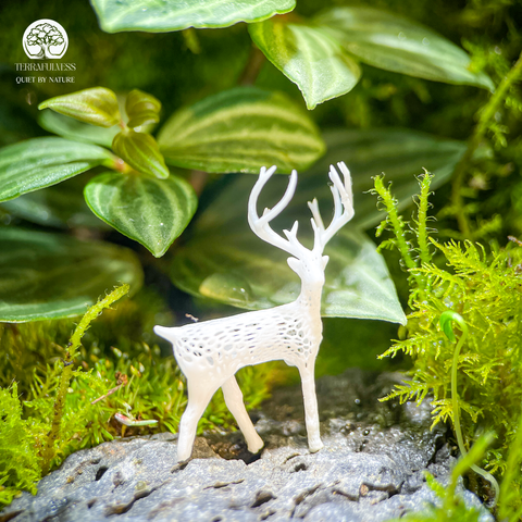 Terrarium Lộc Sơn là một khu rừng thu nhỏ được bao bọc trong chiếc bể kính đứng thanh thoát. Với thảm rêu phủ xanh mướt, xen kẽ những khóm cây Fittonia đỏ nổi bật và cây lá xanh tầng bậc, điểm nhấn là chú hươu trắng nhỏ bé đứng trên phiến đá xám, tất cả gợi nên hình ảnh một vùng núi rừng tĩnh lặng nhưng tràn đầy sức sống. Được đặt trong bể kính đứng dáng cao, Terrarium Lộc Sơn không chỉ mang tính thẩm mỹ mà còn chứa đựng nhiều ý nghĩa: hươu tượng trưng cho sự tài lộc, trường thọ; rêu xanh tượng trưng cho sự sinh sôi và an yên.