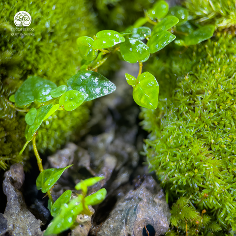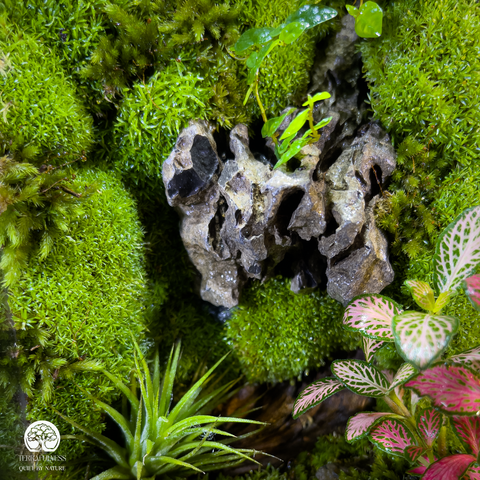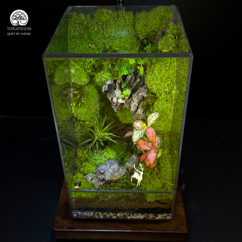 Terrarium Lộc Uyển được thiết kế trong bể chữ nhật đứng, mang phong cách tối giản nhưng đầy cuốn hút. Bên trong là sự kết hợp hài hòa giữa rêu xanh, đá suối, cây Fittonia đỏ - xanh và điểm nhấn chú nai nhỏ thanh thoát. Lớp nền nhiều tầng gồm sỏi trắng, đất giàu dinh dưỡng và thảm rêu dày tạo nên một hệ sinh thái thu nhỏ sống động.