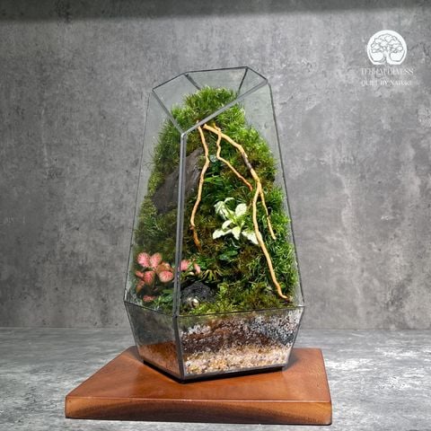 Terrarium Mạch Sống Rừng Xanh không chỉ là một món đồ trang trí, mà là một tiểu cảnh sống động, nơi những rễ cây leo uốn lượn như "mạch sống" len lỏi qua sườn đồi phủ đầy rêu xanh mướt. Với thiết kế khối đa giác sang trọng và bố cục dựng đứng độc đáo, sản phẩm này không chỉ tối ưu không gian mà còn tạo chiều sâu thị giác ấn tượng, mang đến sự tĩnh tại, kết nối nội tâm và nâng tầm không gian sống của bạn.