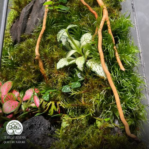 - Rêu sống (rêu nhung, rêu đá, rêu sao): Phủ kín nền và mặt dựng, dễ chăm sóc, giữ ẩm tốt, luôn xanh tươi, mang lại cảm giác thư thái tuyệt đối.
