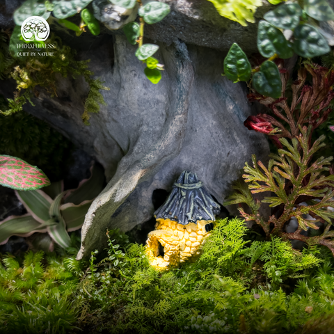 Terrarium Mystic Valley tái hiện một thung lũng cổ tích ẩn sâu trong rừng xanh - nơi ánh sáng dịu nhẹ soi xuống từng thảm rêu mềm, những tán lá Fittonia rực sắc, những cụm dương xỉ tươi non và những ngôi nhà nhỏ phát sáng giữa màn đêm như những linh hồn rừng đang thì thầm kể chuyện.