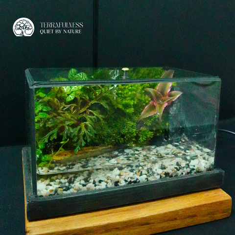 Terrarium Bán Cạn Mini mang đến một góc thiên nhiên thu nhỏ trong bể kính chữ nhật. Sản phẩm kết hợp hài hòa giữa phần cạn và phần nước, với bố cục rêu xanh, cây thủy sinh, đá tự nhiên và lớp sỏi trắng. Tất cả tạo nên một tiểu cảnh Terrarium thủy sinh cạn sinh động, dễ chăm sóc và phù hợp cho nhiều không gian sống.