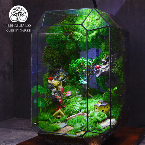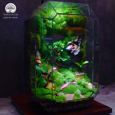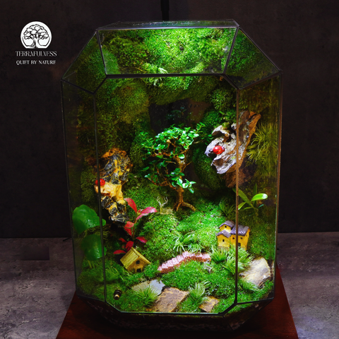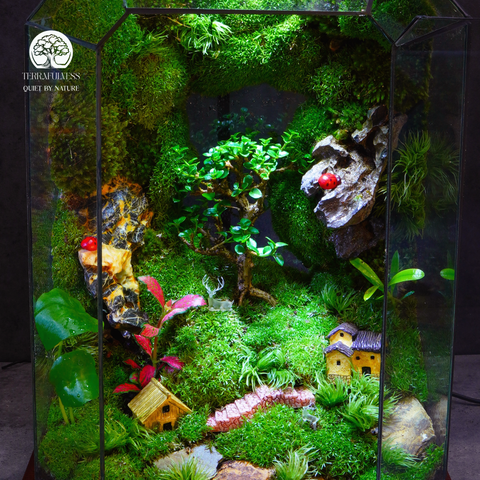 Terrarium Xứ Sở Thần Tiên mang bạn bước vào một thế giới thu nhỏ đầy màu sắc, nơi rêu xanh, cây lá và tiểu cảnh hòa quyện thành khung cảnh như bước ra từ câu chuyện cổ tích. Bể đa giác kính trong suốt giúp phô bày toàn bộ vẻ đẹp tự nhiên từ mọi góc nhìn, kết hợp ánh sáng và bố cục tinh tế để tạo chiều sâu cuốn hút cho Terrarium.