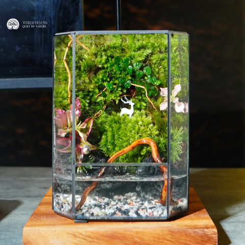 Terrarium Rừng Thiên tái hiện một góc thu nhỏ của một khu rừng tĩnh lặng bên dưới là mặt hồ nhỏ, kết hợp rêu xanh, đá đen Gia Lai, sỏi trắng, lũa và mô hình decor trong bể kính đa diện sang trọng. Thiết kế này mang đến một điểm nhấn Terrarium nghệ thuật tự nhiên, giúp không gian sống trở nên hài hòa và gần gũi hơn với thiên nhiên.