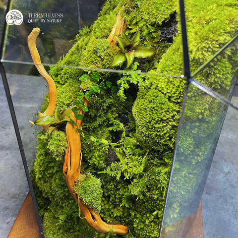 - Rêu xanh tự nhiên: Phủ đều trên nền và vách đá, giữ ẩm tốt, mang sắc xanh tươi mát quanh năm, là nền tảng sống động của Terrarium.