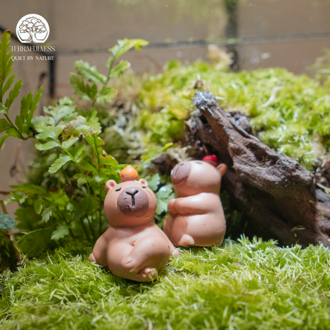 Whispering Grove (Rừng già thì thầm) mang đến một góc nhìn mới lạ về nghệ thuật Terrarium. Trong chiếc bể đa giác sang trọng, một thung lũng rêu xanh mướt hiện ra với điểm nhấn là bộ đôi Capybara đang tận hưởng sự thư thái. Đây là món đồ decor inside the house hoàn hảo để kiến tạo không gian sống Peaceful (Bình yên) và đầy ắp sự tích cực.