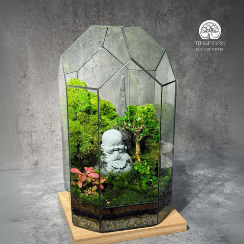 Terrarium Zen Phật Di Lặc là một tác phẩm nghệ thuật mini, là sự kết hợp hoàn hảo giữa thiết kế terrarium thiền hiện đại và ý nghĩa tâm linh sâu sắc. Sản phẩm được đặt trang trọng trong bể thủy tinh đa giác cao cấp, tạo nên một không gian tĩnh lặng, đầy năng lượng tích cực, lý tưởng để trang trí bàn làm việc, góc học tập hoặc khu vực thiền định cá nhân.