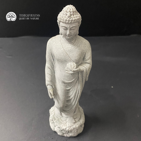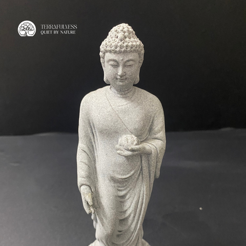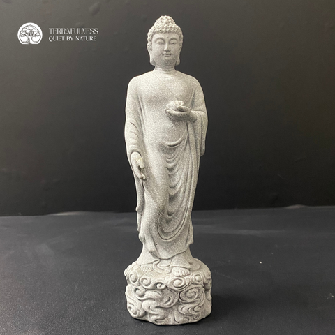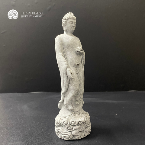 Tư thế đứng trên mây thể hiện hình ảnh Phật đang hóa độ từ cõi Tịnh Độ, mang ánh sáng từ bi soi chiếu khắp nơi. Khi đặt trong terrarium, tượng Phật A Di Đà trở thành cốt lõi tinh thần – nơi tâm trí được hướng về ánh sáng và sự thanh lọc.