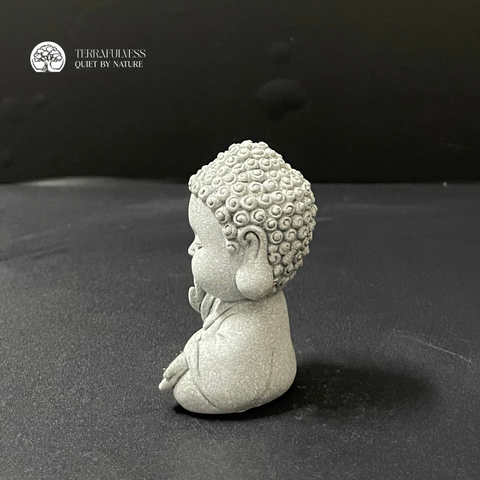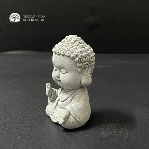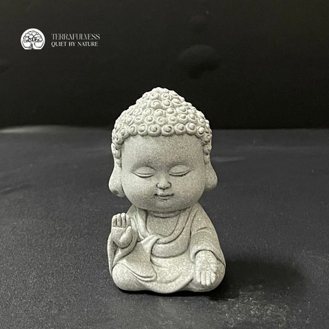 Tượng Tiểu Phật An Thủ Ấn tái hiện hình ảnh chú tiểu đang ngồi thiền với bàn tay phải giơ lên trong tư thế thủ ấn hộ trì, bàn tay trái mở nhẹ đón nhận năng lượng. Đây là biểu tượng cổ điển trong Phật giáo, đại diện cho sự bảo hộ, tiếp nhận trí tuệ và lan tỏa từ bi. Với đôi mắt khép hờ, nét mặt mỉm cười thư thái, tượng mang lại cảm giác bình yên, thanh lọc và vững chãi cho không gian sống.