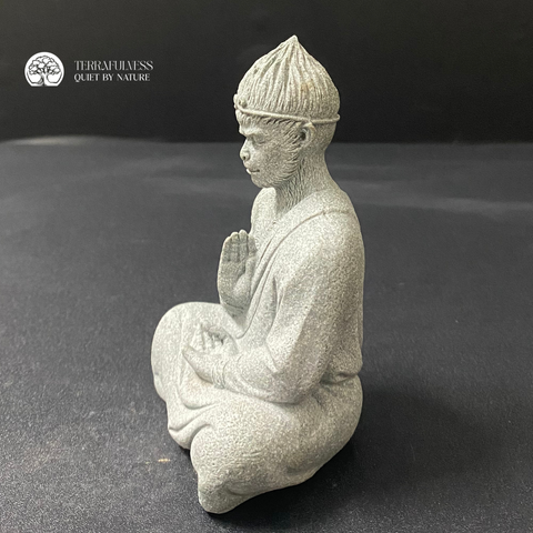 Tượng có dáng ngồi thiền vững chãi, tay đặt nhẹ trên đầu gối, ánh mắt khép hờ trong sự an định. Kích thước vừa vặn để làm điểm nhấn trung tâm, đặt trên nền rêu, bệ đá hoặc phối cùng đèn đá, cổng đá để tạo chiều sâu bố cục.