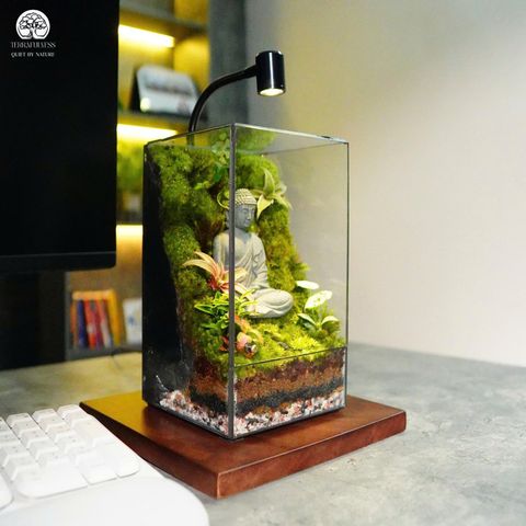 Khám phá sự hòa quyện giữa nghệ thuật và tĩnh lặng với Terrarium Tĩnh Tâm Giữa Vòng Gỗ – Bể Chữ Nhật Đứng Size Trung. Tiểu cảnh thiền định độc đáo này mang đến một không gian thanh bình, nơi tượng Phật an nhiên ngự giữa vòng gỗ lũa tự nhiên uốn lượn, được tô điểm bởi sắc xanh mướt của rêu và dây leo, cùng nét chấm phá rực rỡ của fittonia đỏ. Đây không chỉ là một vật trang trí, mà là một tác phẩm nghệ thuật tự nhiên, mang đến sự tĩnh tâm cho góc thiền, vẻ đẹp độc đáo cho bàn làm việc, kệ sách, hay một món quà ý nghĩa chạm đến trái tim.